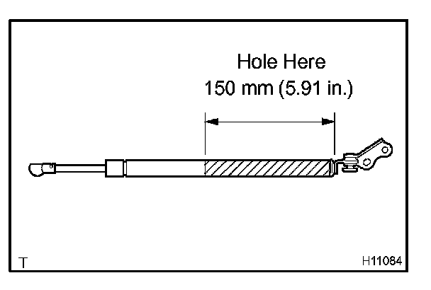 - If the back door stay is to be replaced, drill a 2.0 - 3.0 mm (0.079 - 0.118 in.) hole in the bottom of the back door stay as shown in the illustration to completely release the high pressure gas before disposing of it.