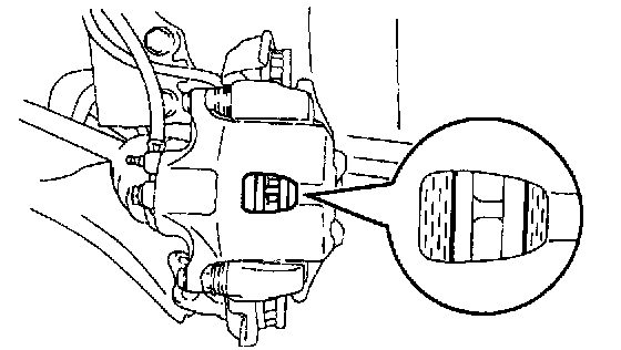 Check the pad thickness through the caliper inspection hole and replace the pads if they are not within the specification.