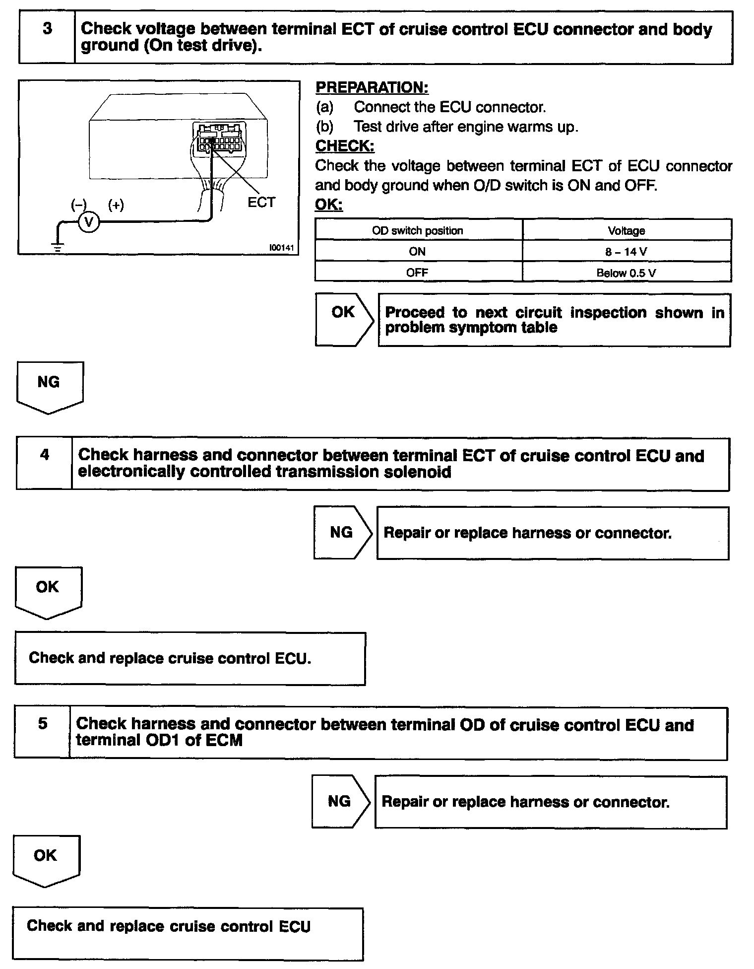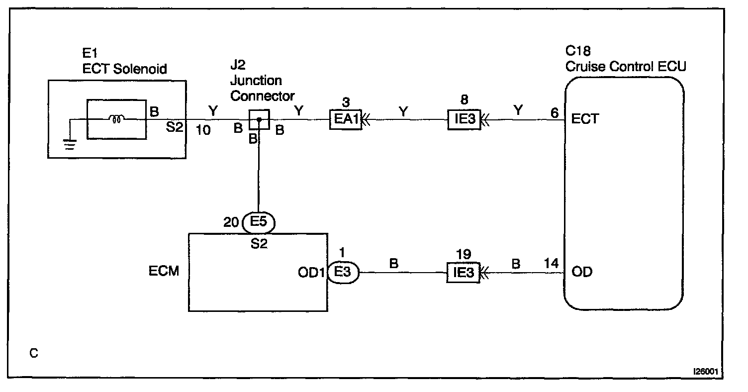 CIRCUIT DESCRIPTIONWhen driving uphill under the cruise control and the shift-down occurred in the electronically controlled transmission, the cruise control ECU sends a signal there to suspend the shift-up until the vehicle reaches the top of the hill. This will provide smooth driving, and there is no need for ON-OFF overdrive operation. Terminal ECT of the cruise control ECU detects the shift change signal (output to electronically controlled transmission No.2 solenoid) from ECM.