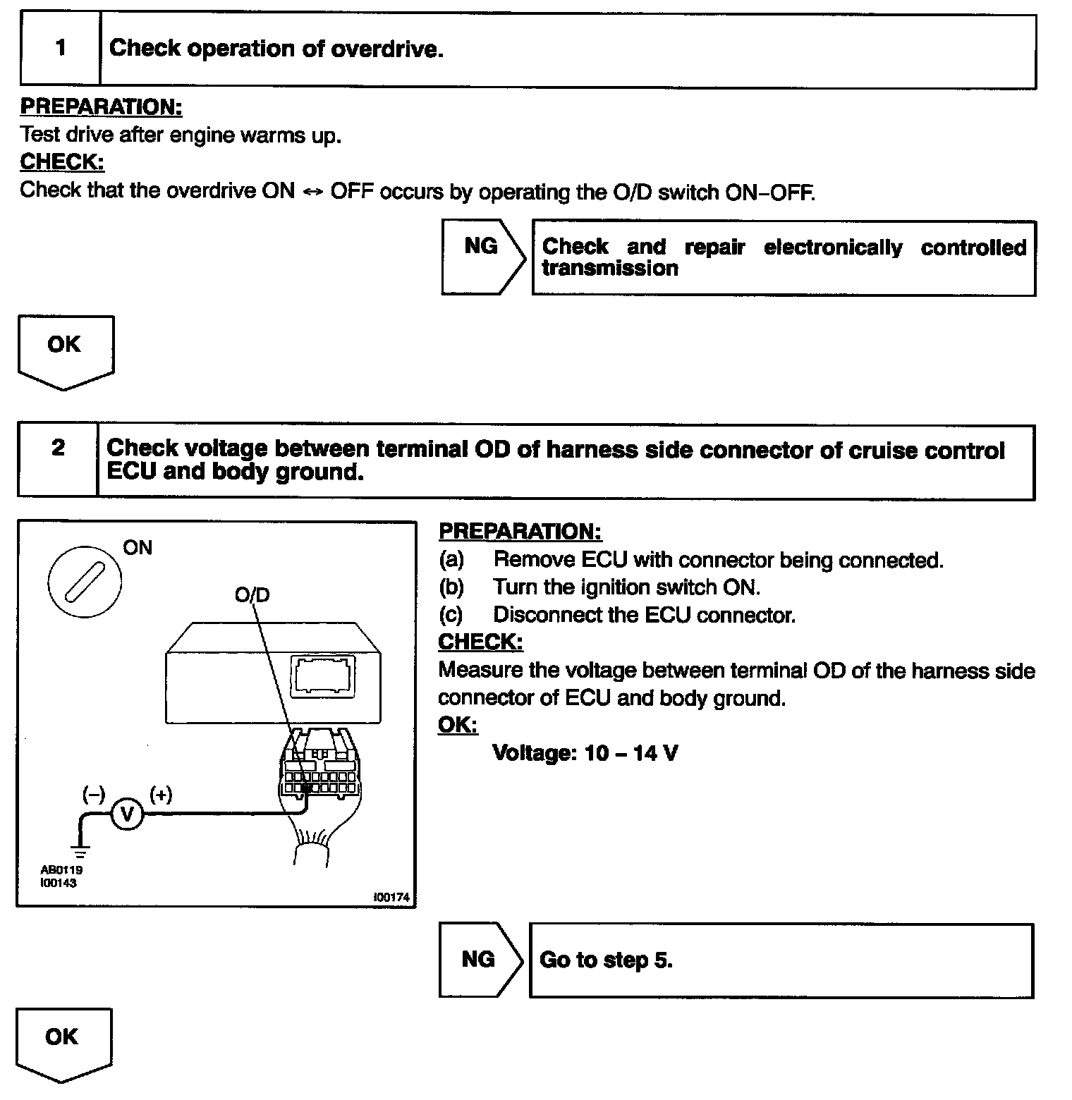 If the vehicle speeds down and when terminal ECT receives the shift-down signal, ECU sends a signal from terminal OD to ECM to stop the overdrive until the end of the uphill slope, and the gear shift points in the electronically controlled transmission are changed.