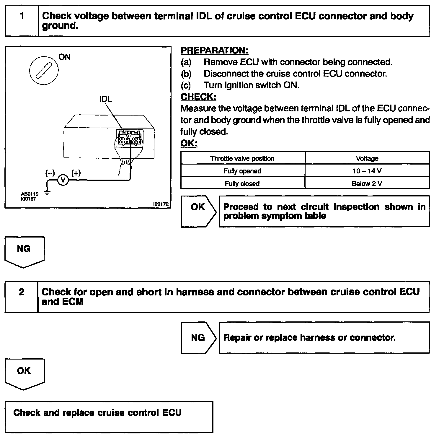 CIRCUIT DESCRIPTIONWhen the idle switch is turned ON, a signal is sent to the ECU. The ECU uses this signal to correct the discrepancy between the throttle valve position and the actuator position sensor value to enable accurate cruise control at the set speed. Since there will also be a problem when the idle switch malfunctions, inspect both the switch and the engine if the idle switch is faulty.