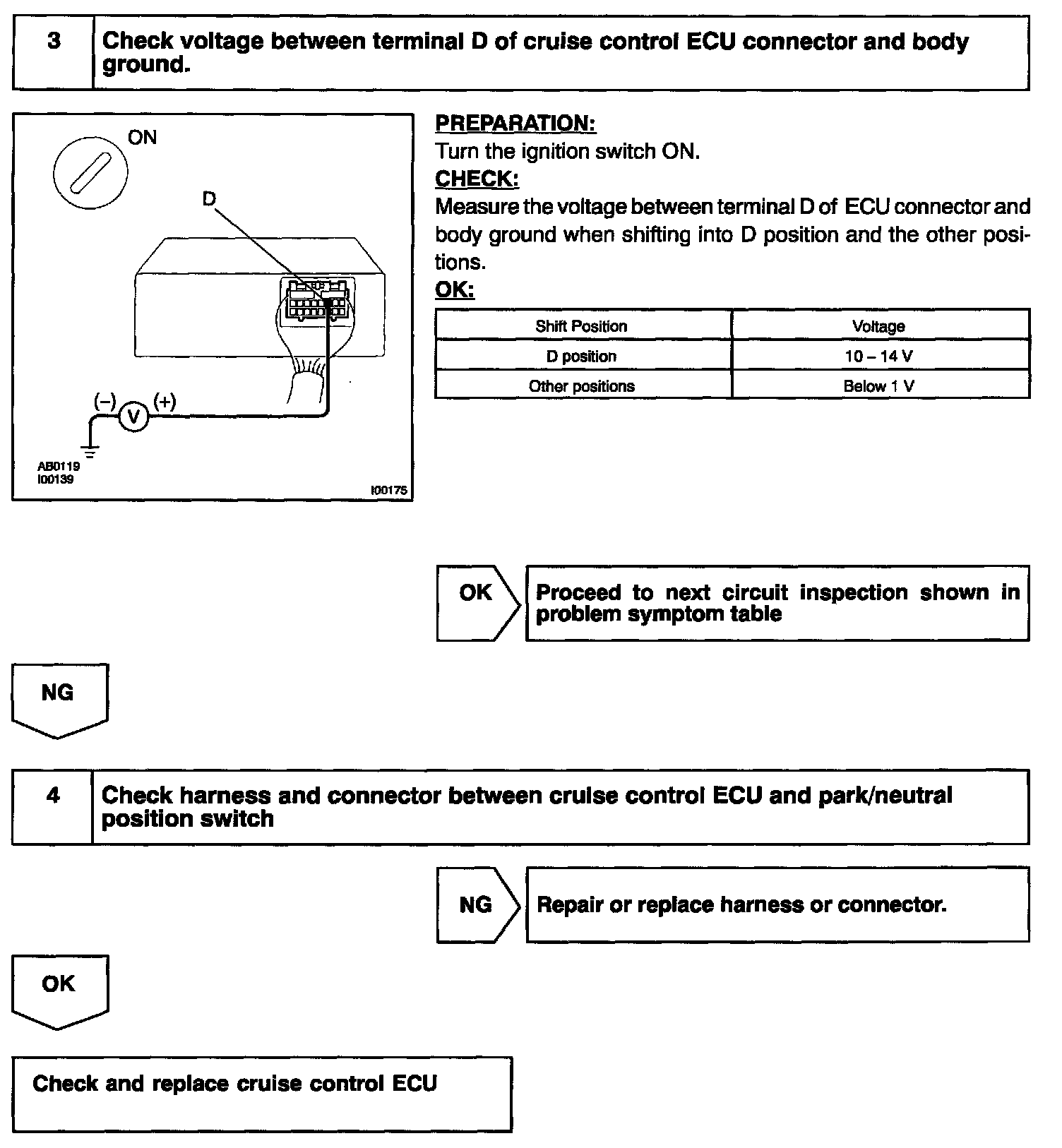 CIRCUIT DESCRIPTIONWhen the shift position is except D, a signal is sent from the park/neutral position switch to ECU. When this signal is input during cruise control driving, ECU cancels the cruise control.