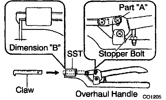 a. Install the claw to the overhaul handle, inserting it in the hole in part "A" as shown in the diagram.