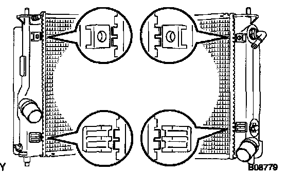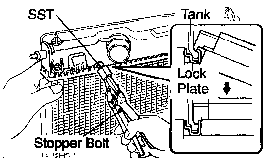 ^ The points shown in the illustration and oil cooler near here (A/T) cannot be staked with SST. Use wrap vinyl tape around the tip of a pair or similar object and be careful not to damage the core plates.