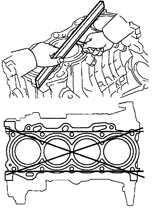 Using a precision straight edge and feeler gauge, measure the surface contacting the cylinder head gasket for warpage.