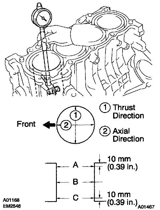 c. Measure the cylinder bore diameter in the thrust directions (See procedure in step 5).