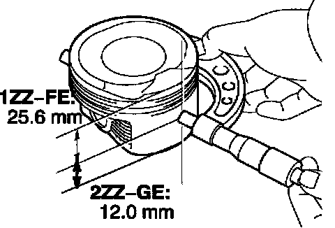 b. 2ZZ-GE: Using a micrometer, measure the piston diameter at right angles to the piston pin center line, 12.0 mm (0.048 inch) from the piston bottom.