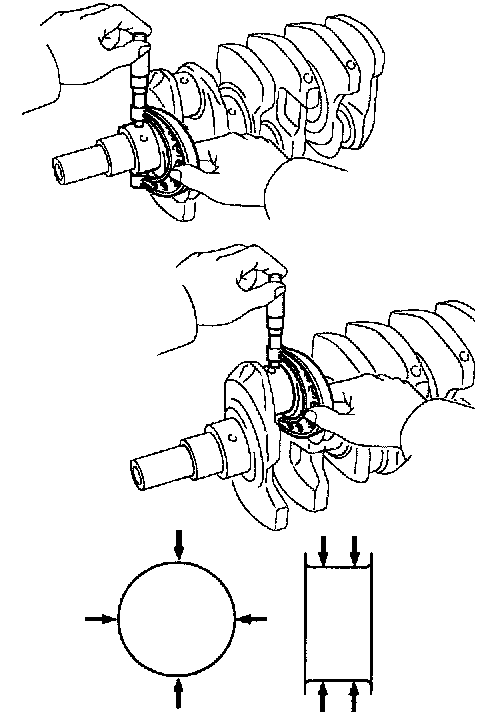b. Check each main journal and crank pin for taper and out-of-round as shown.