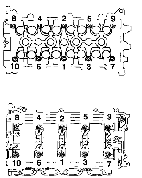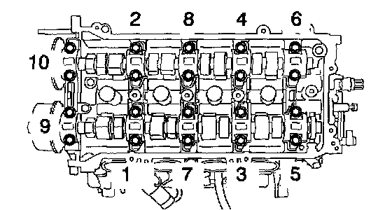 b. Using a 10 mm bi-hexagon wrench, install and uniformly tighten the 10 cylinder head bolts and plate washers, in several passes, in the sequence shown.