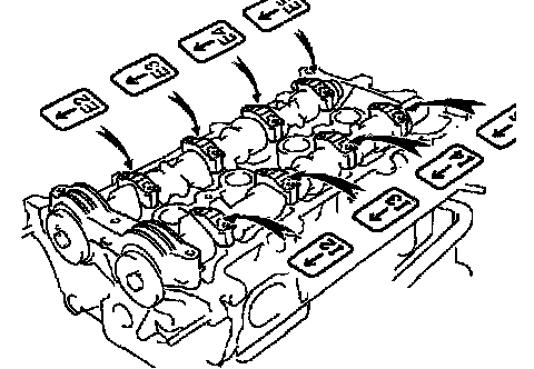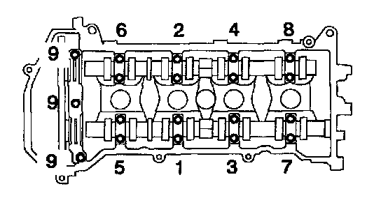 After tightening the No. 1 camshaft bearing cap, tighten then in several passes, in the sequence shown.