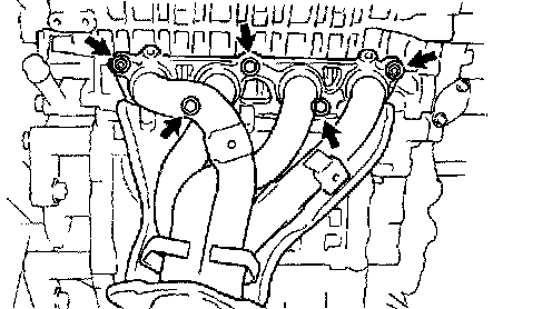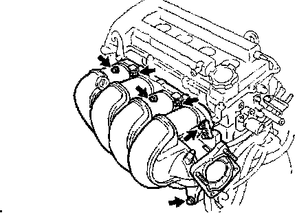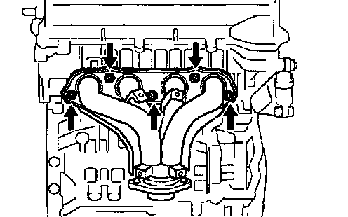 b. Install the exhaust manifold with the 3 bolts and 2 nuts.