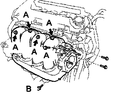 b. Install a new gasket, the intake manifold with the 4 bolts and 2 nuts.