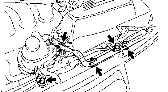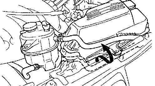 d. Lift the engine coolant reservoir and hook it on a hood latch to fix.
