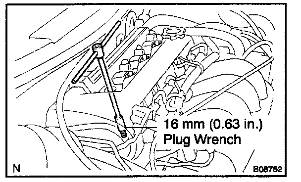 b. Using a 16 mm (0.63 in.) plug wrench, remove the spark plugs.