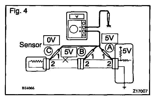 As shown in Fig. 4, with each connector still connected, measure the voltage between body ground and terminal 1 of connector "A" at the ECU 5 V output terminal, terminal 1 of connector "B", and terminal 1 of connector "C", in that order.