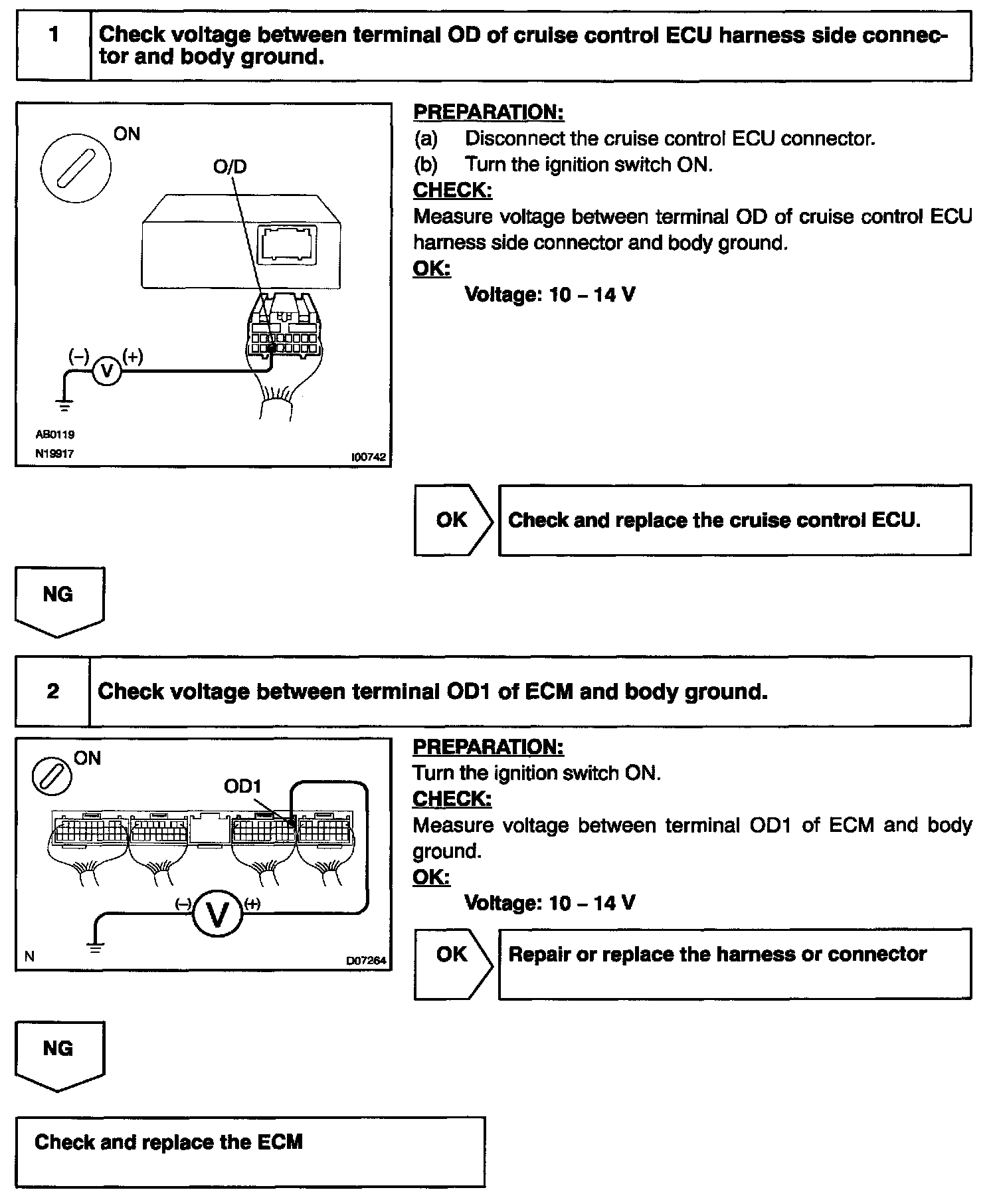 The cruise control ECU sends O/D cut signals to the ECM as necessary and the ECM cancels overdrive shifting until these signals are discontinued.