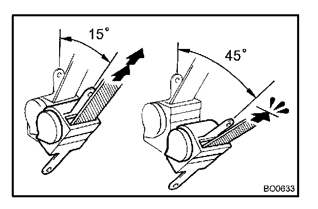 d. Make sure that the belt can be pulled out at a tilt of 15 degrees or less, and cannot be pulled out over 45 degrees of tilt.