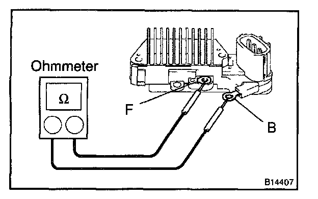 a. Using an ohmmeter, connect one tester probe to the positive (+) terminal and the other to each rectifier terminal.