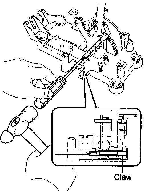Using a screwdriver and hammer, drive off the shaft control while disengaging the claw of the shaft control and remove the shift lever sub-assembly.
