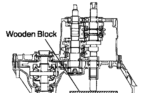 ^ Before driving in the No.3 clutch hub assembly, place the suitable sized wooden block on the rear side of the input shaft, as shown in the illustration. When driving it in, fix the input shaft firmly so that it is not pushed downward. Otherwise the input shaft rear radial ball bearing is overloaded, it might be damaged.