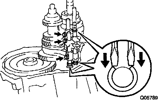 To avoid the interference of the 2 balls, lift up the No. 3 gear shift fork shaft at the position shown in the illustration.