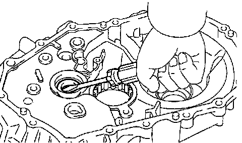 ^ Fit the claw of the reverse shift arm bracket with the notch of the input shaft front bearing.