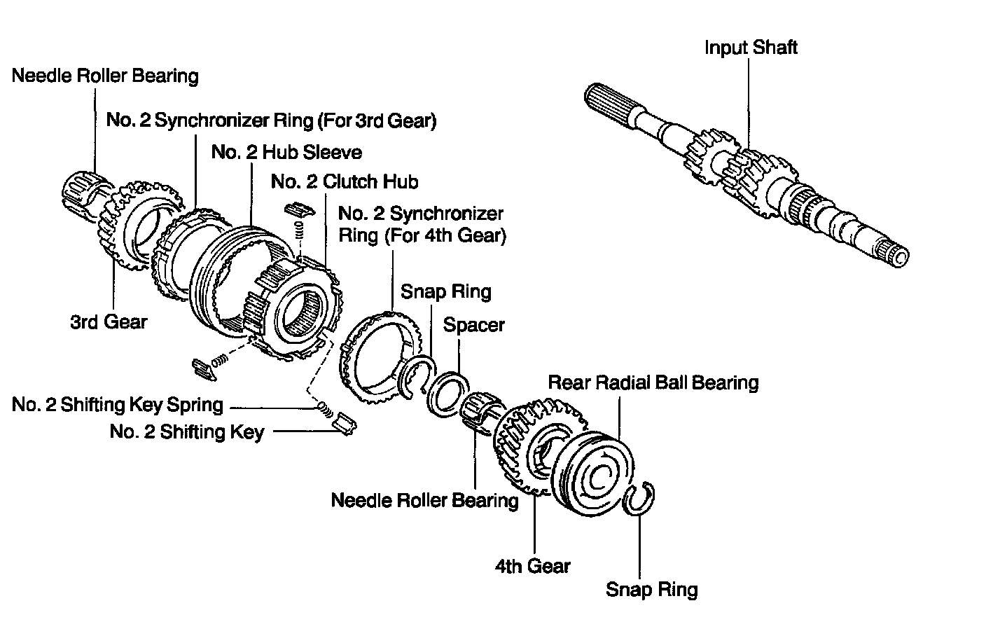 4. REMOVE REAR RADIAL BALL BEARING, 4TH GEAR, NEEDLE ROLLER BEARING, SPACER AND NO. 2 SYNCHRONIZER RING (FOR 4TH GEAR) FROM INPUT SHAFT