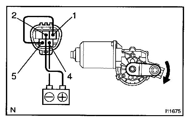 Connect the positive (+) lead from the battery to terminal 1, and the negative (-) lead to terminal 2 and the motor body, check that the motor operates intermittently for 9 - 15 seconds. If operation is not as specified, replace the motor and relay.