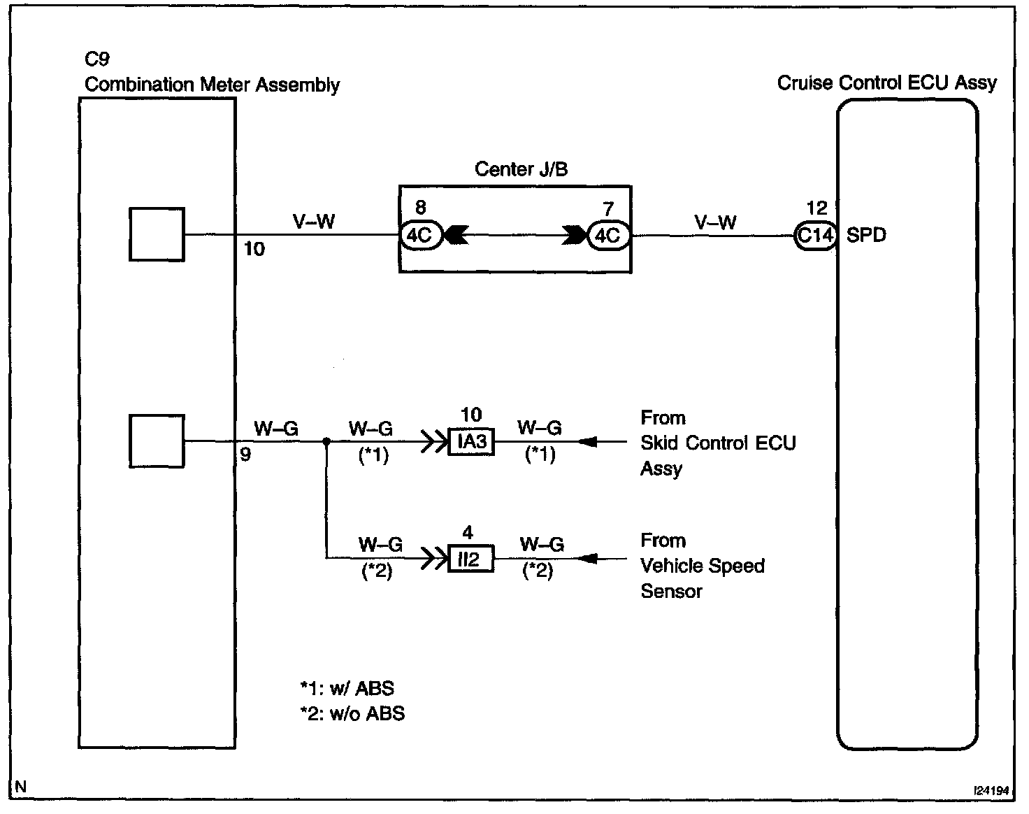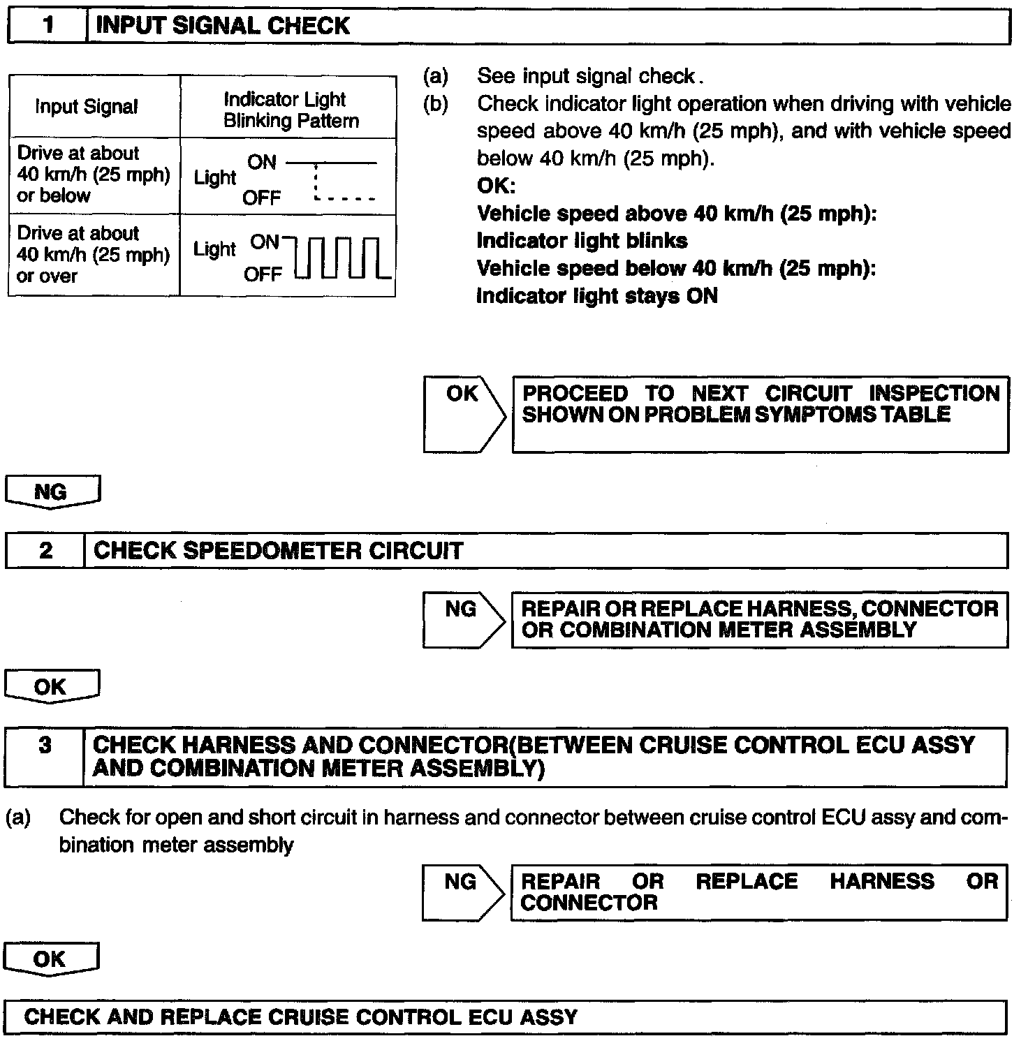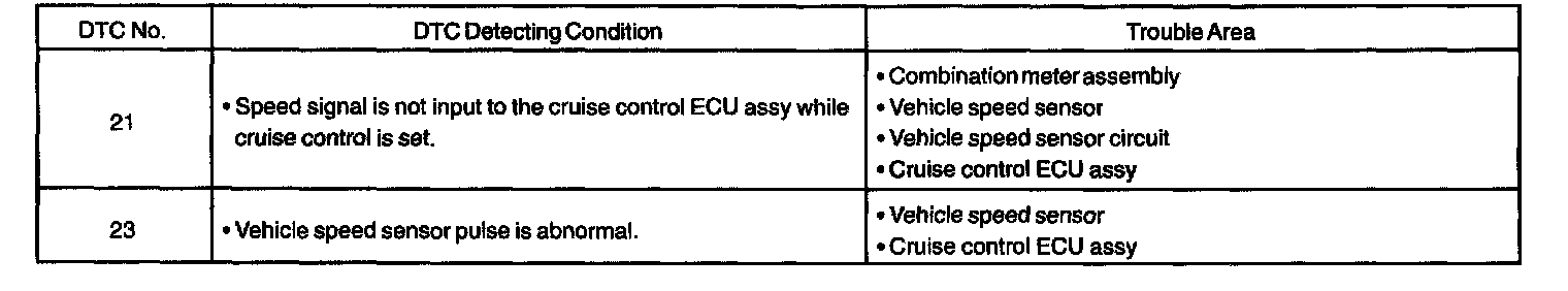 The vehicle speed sensor circuit is sent to cruise control ECU assy as a vehicle speed signal. For each rotation of the shaft, the vehicle speed sensor sends a signal through the combination meter assembly to the cruise control ECU assy (See the given chart). The cruise control ECU assy calculates the vehicle speed from this pulse frequency.