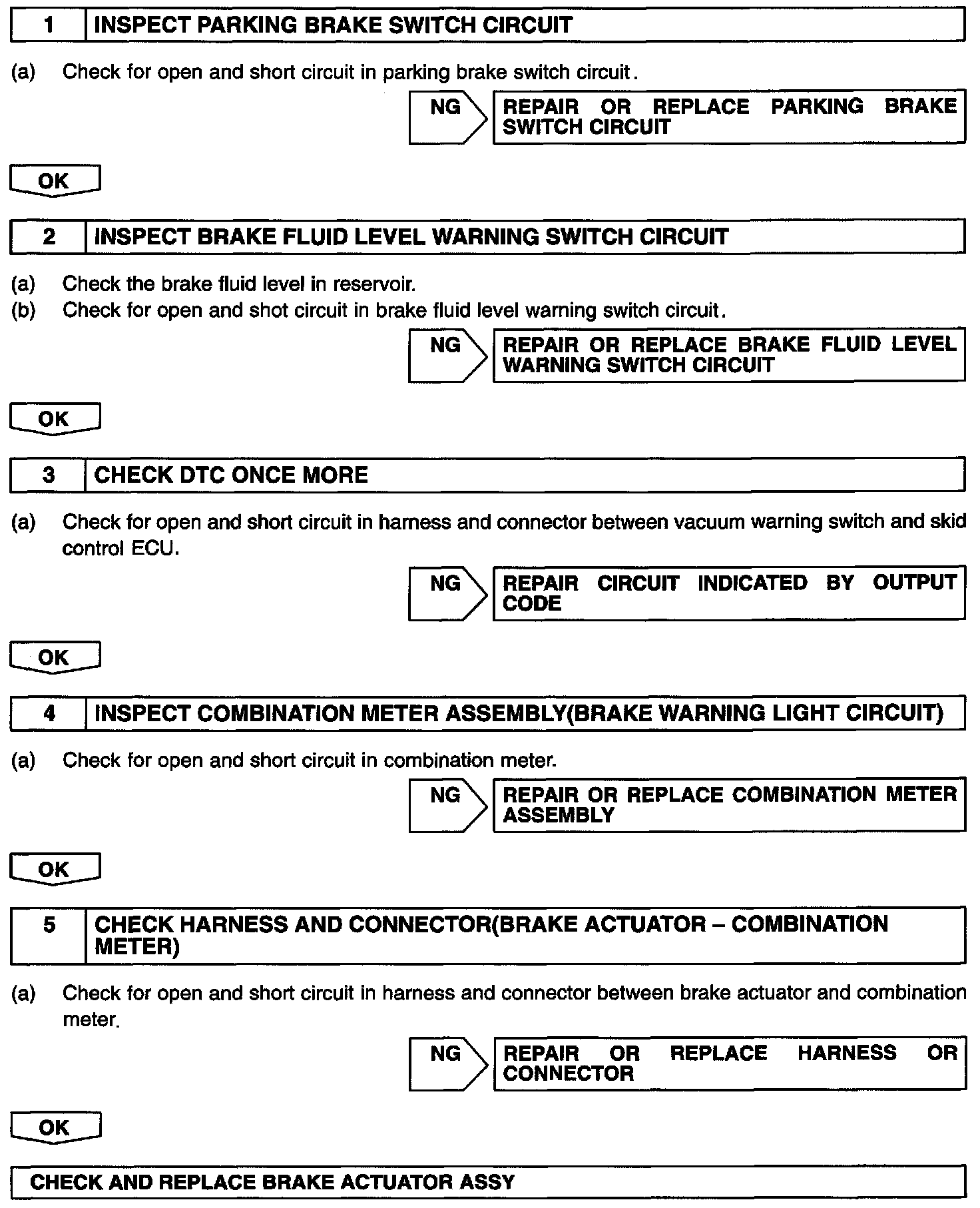 If the ECU detects trouble, it lights the brake warning light at the same time of prohibiting ABS control. At this time, the ECU records a DTC in memory.