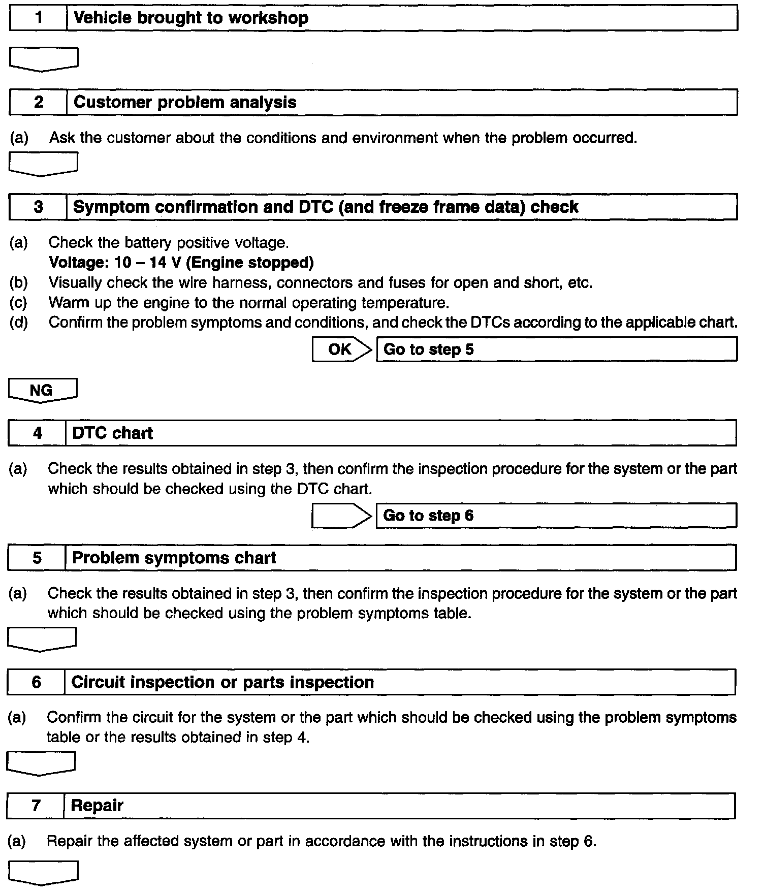 HOW TO PROCEED WITH TROUBLESHOOTINGHINT: Carry out a troubleshooting in accordance with the procedures. Here, only the basic procedures are shown. Details are provided in the applicable diagnostics section, showing the most effective methods for each circuit. Confirm the troubleshooting procedures first for the relevant circuit before beginning the troubleshooting of that circuit.