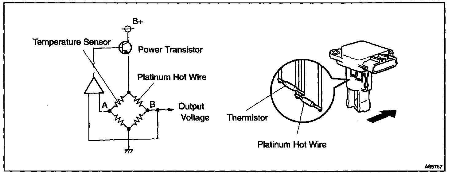 The mass air flow meter uses a platinum hot wire. The hot wire air flow meter consists of a platinum hot wire, thermistor and a control circuit installed in a plastic housing. The hot wire air flow meter works on the principle that the hot wire and thermistor located in the intake air bypass of the housing detect any changes in the intake air temperature.