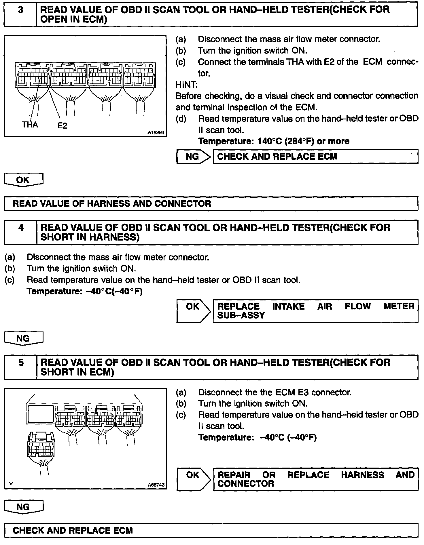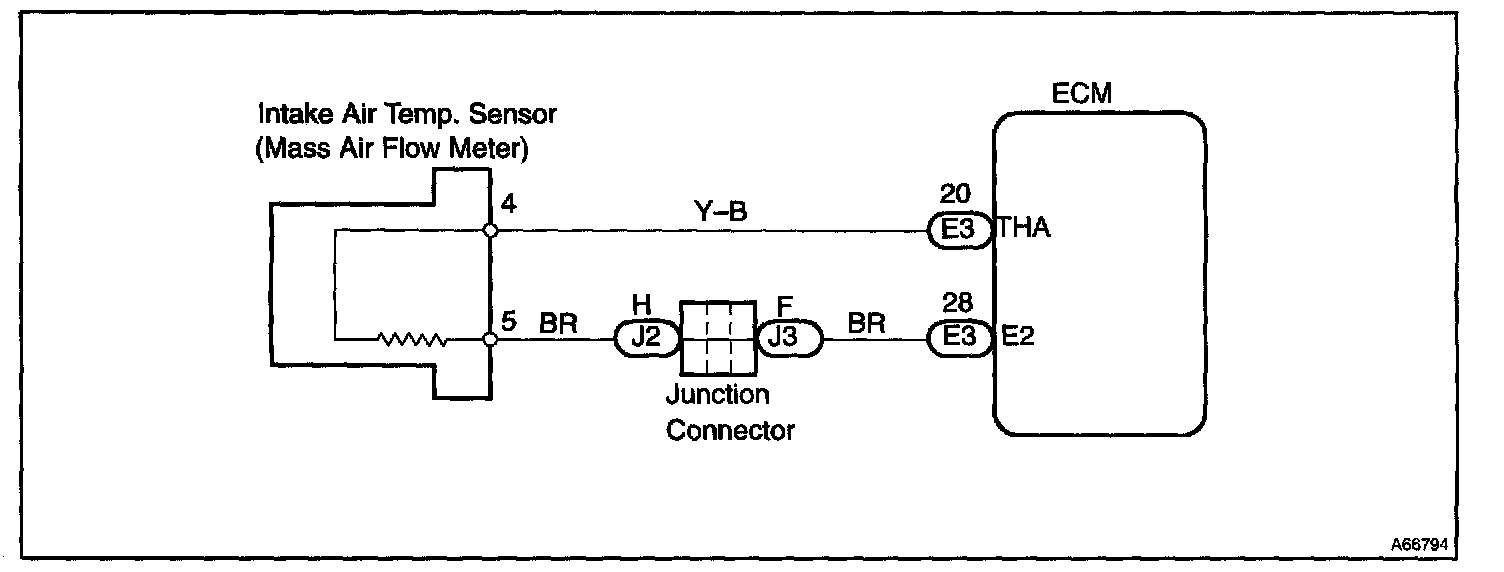 The intake air temp. sensor is connected to the ECM. The 5 V power source voltage in the ECM is applied to the intake air temp. sensor from the terminal THA via resistor R. That is, the resistor R and the intake air temp. sensor are connected in series. When the resistance value of the intake air temp. sensor changes in accordance with changes in the intake air temperature, the potential at terminal THA also changes. Based on this signal, the ECM increases the fuel injection volume to improve driveability during cold engine operation.