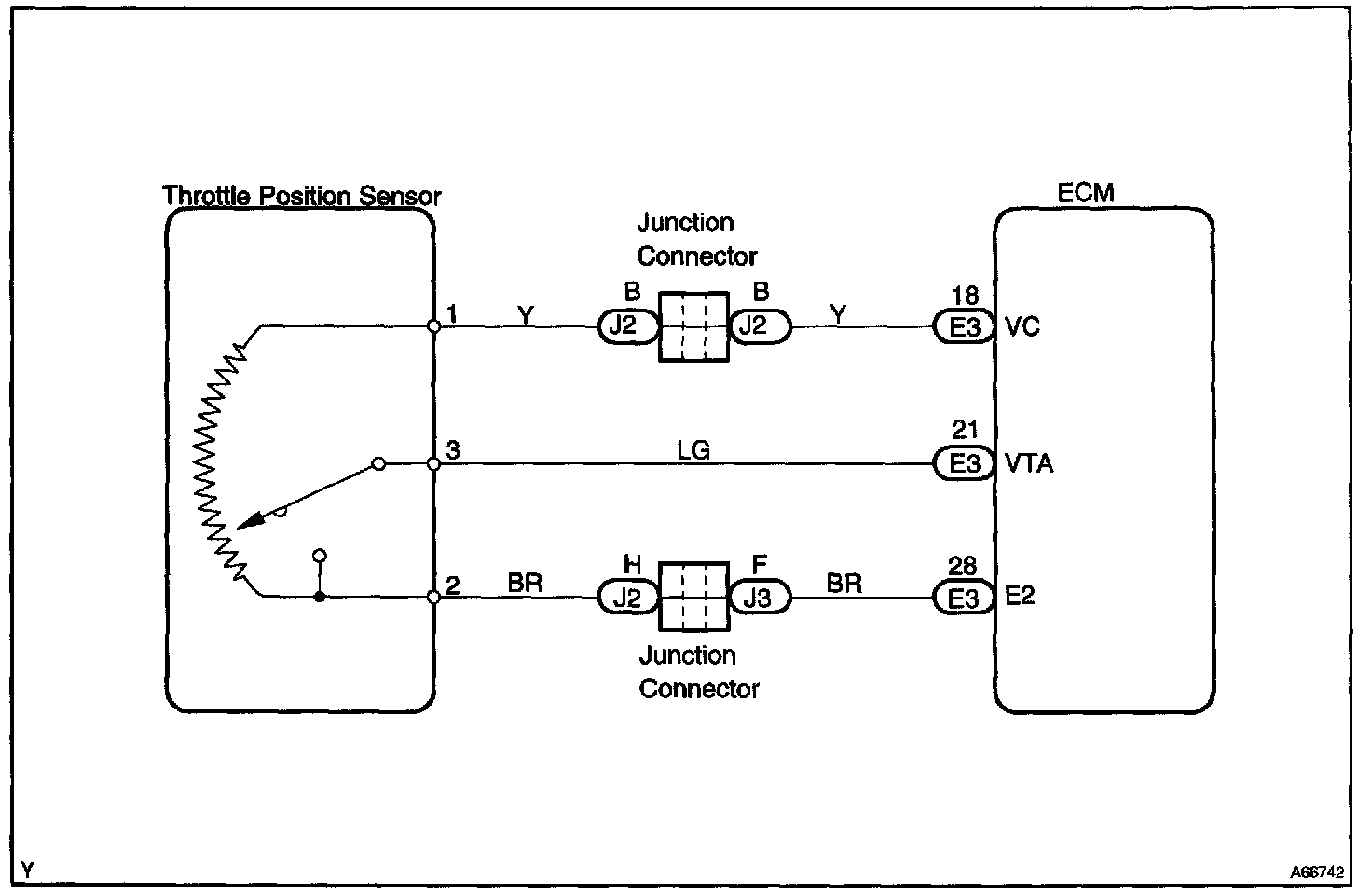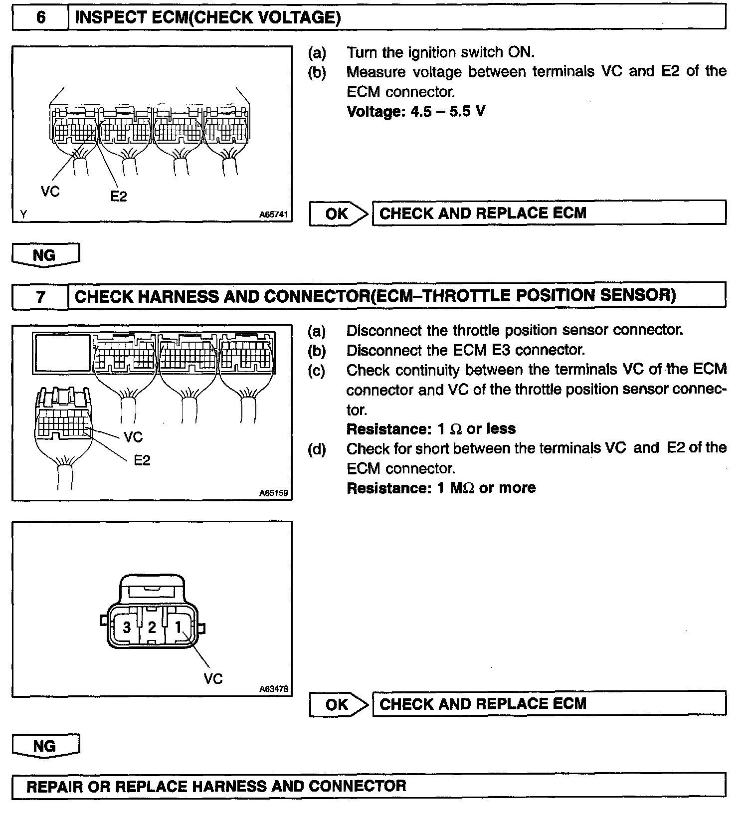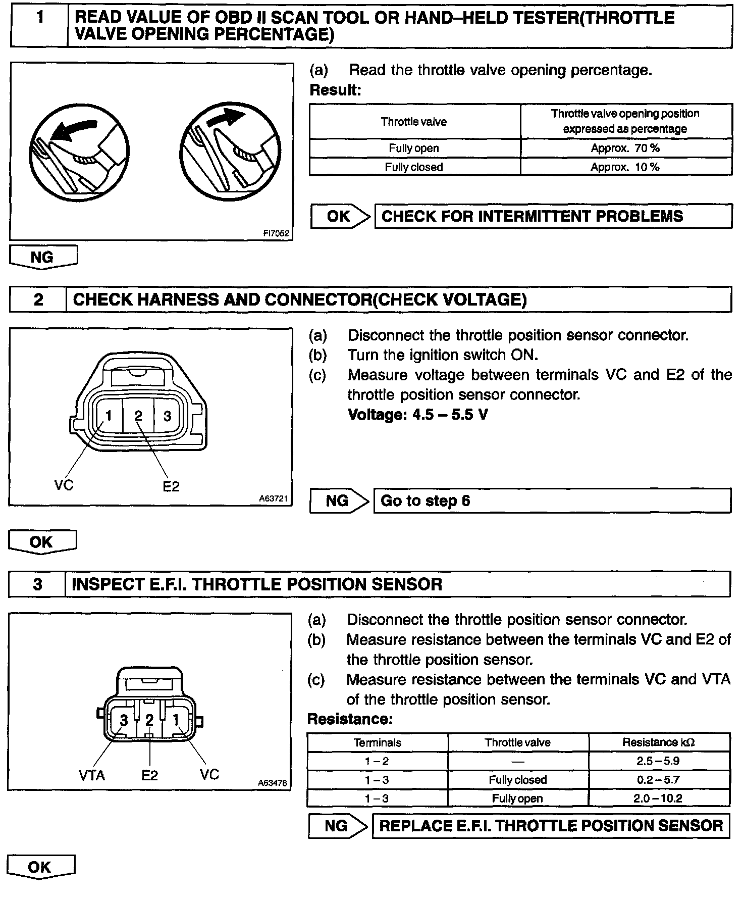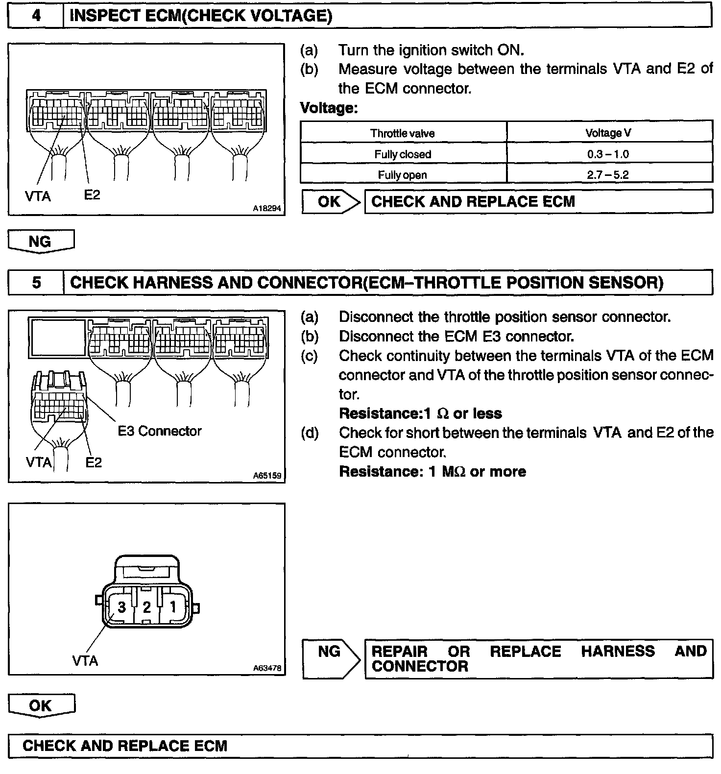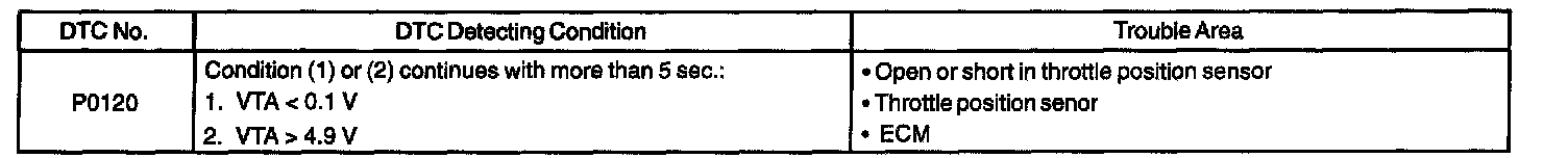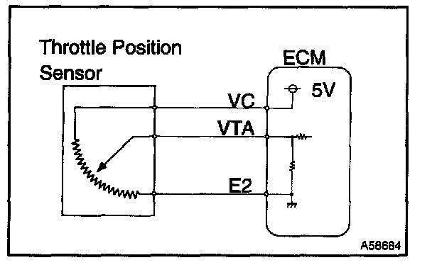 When the throttle valve is fully closed, a voltage of approximately 0.3 - 1.0 V is applied to terminal VTA of the ECM. The voltage applied to the terminals VTA of the ECM increases in proportion to the opening angle of the throttle valve and becomes approximately 3.2 - 4.9 V when the throttle valve is fully opened. The ECM judges the vehicle driving conditions from these signals input from terminal VTA, uses it as one of the conditions for deciding the air-fuel ratio correction, power increase correction and fuel-cut control etc.