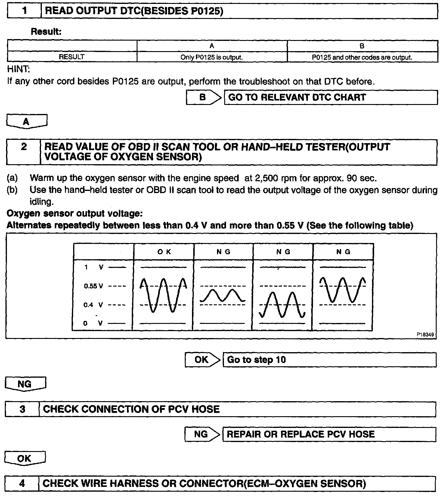 HINT: After confirming DTC P0125, use the hand-held tester or OBD II scan tool to confirm output voltage of the oxygen sensor from the CURRENT DATA.