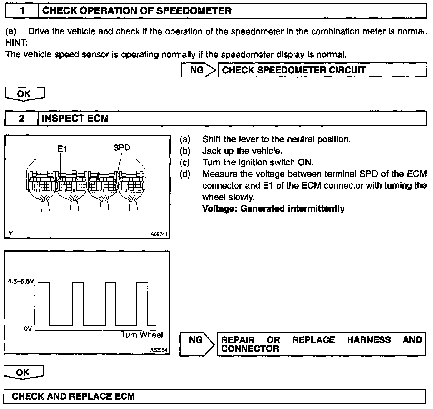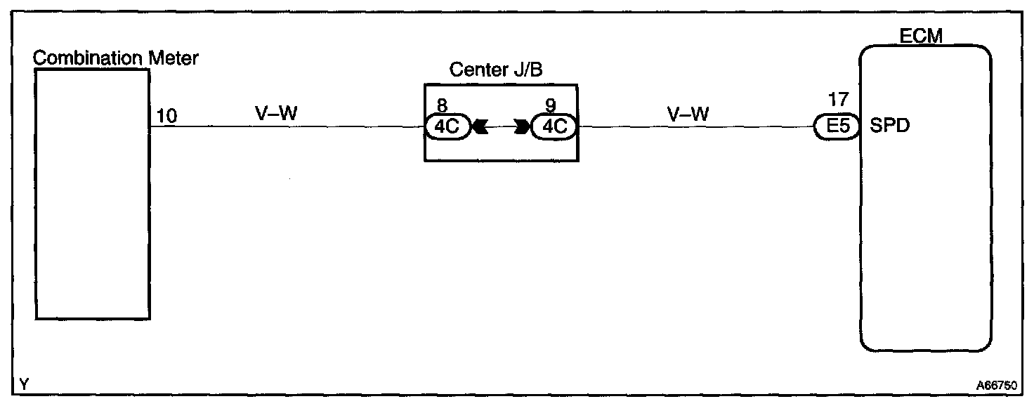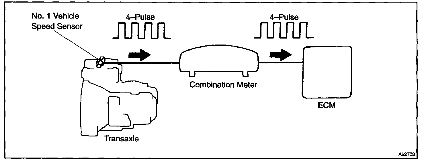 The vehicle speed sensor outputs a 4-pulse signal for every revolution of the rotor shaft, which is rotated by the transmission output shaft via the driven gear. After this signal is converted into a more precise rectangular waveform by the waveform shaping circuit inside the combination meter, it is then transmitted to the ECM. The ECM determines the vehicle speed based on the frequency of these pulse signals.