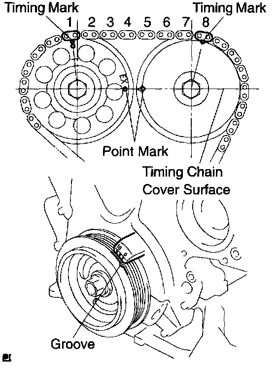 2. Check that the point marks of the camshaft timing gears are in straight line on the timing chain cover surface as shown in the illustration.