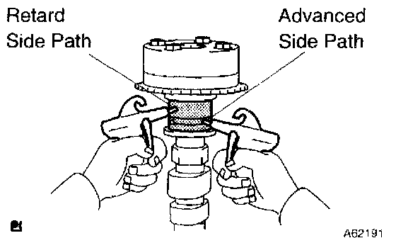 4. Confirm if the camshaft timing gear assembly revolves in the timing advance direction when weakening the air pressure of the timing retard path.
