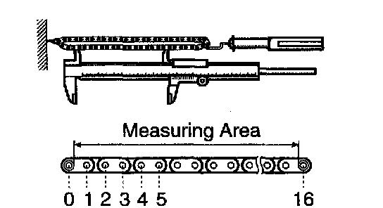 NOTICE: Vernier calipers must contact the chain rollers for the measuring.