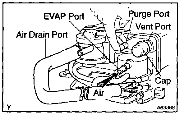 5. While holding the air inlet port closed, apply vacuum (3.43 kPa, 25.7 mmHg, 1.01 in.Hg) to the EVAP port and check that air flows into the purge port.