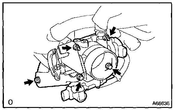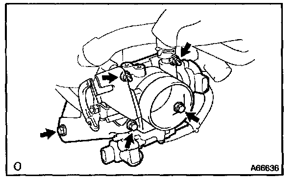 e. Remove 5 bolts, 2 nuts, throttle body bracket and throttle body. (Transaxle M/T)