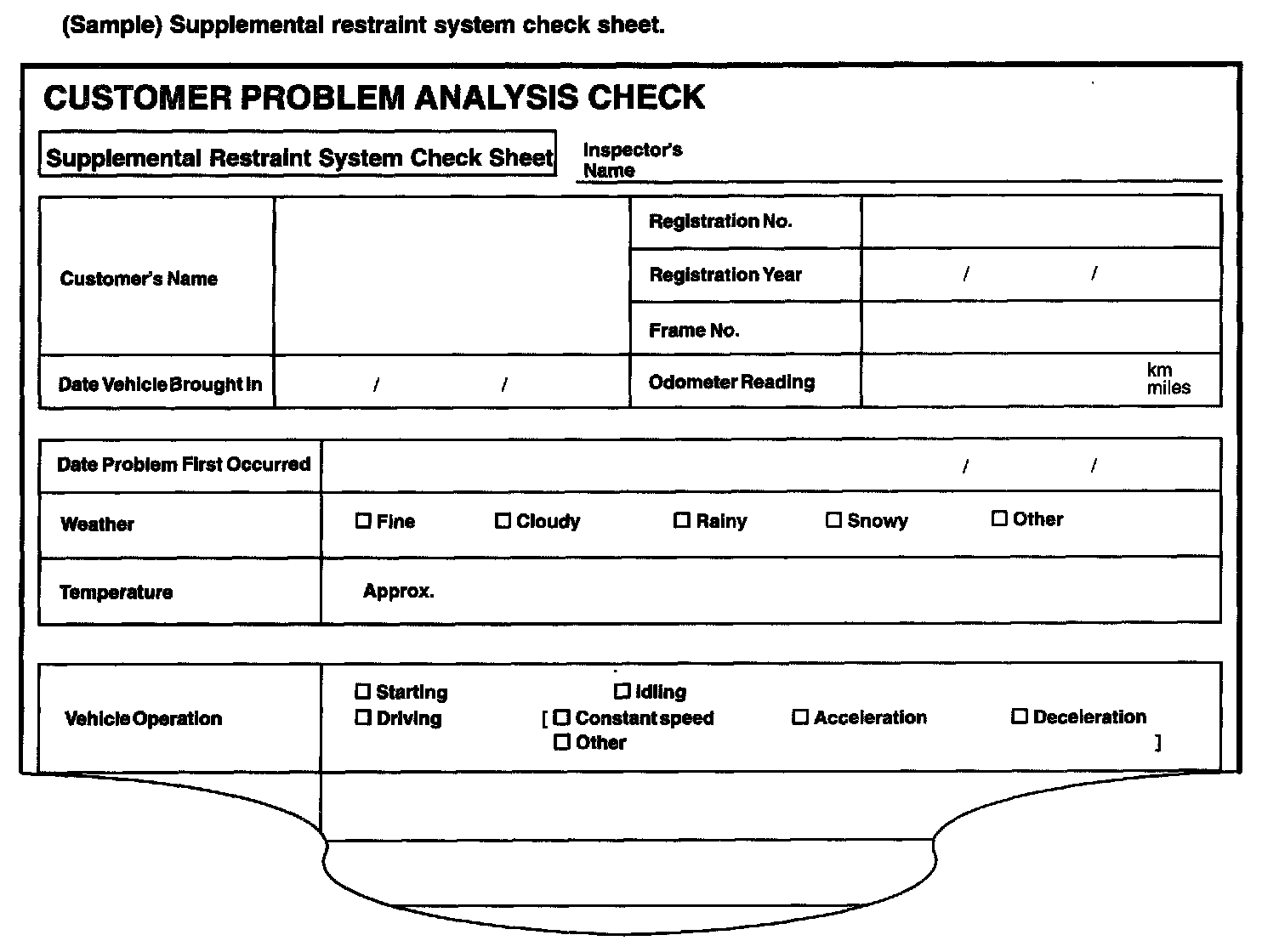 - The following 5 items are important points in the problem analysis. Past problems which are thought to be unrelated and the repair history, etc. may also help in some cases. So, as much information as possible should be gathered and its relationship with the problem symptoms should be correctly ascertained for a reference in troubleshooting. A customer problem analysis table is provided in the applicable diagnostics section for each system for your use.