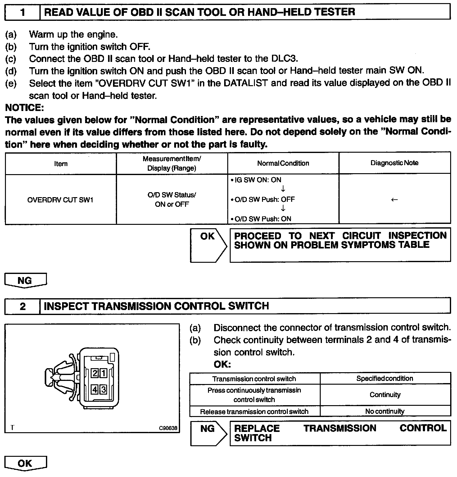 The O/D main switch is a momentary type switch. When pressing the O/D main switch, the O/D OFF indicator light comes on and the ECM prohibits shifting into O/D, and when pressing it once again, the O/D OFF indicator light goes off and the ECM allows shifting into O/D. Turning the IG switch OFF will reset the O/D OFF indicator light.