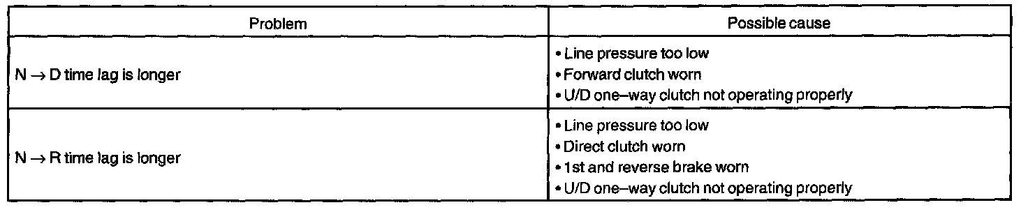 When the shift lever is shifted while the engine is idling, there will be a certain time lapse or lag before the shock can be felt. This is used for checking the conditions of the O/D direct clutch, forward clutch, and 1st and reverse brake.