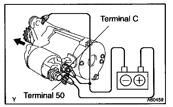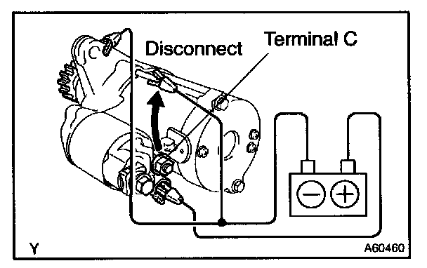 c. With battery connected as above with the clutch pinion gear out, disconnect the negative (-) lead from terminal C. Check that the pinion gear remains out.