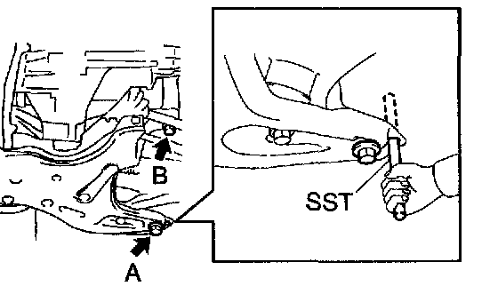 d. Using SST, align the holes of the front suspension member LH and body, and torque the bolt A and B.