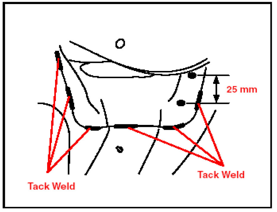 5. Using 7 - 10 mm tack welds (thick black line in illustration) weld the package tray to the wheelhouse.