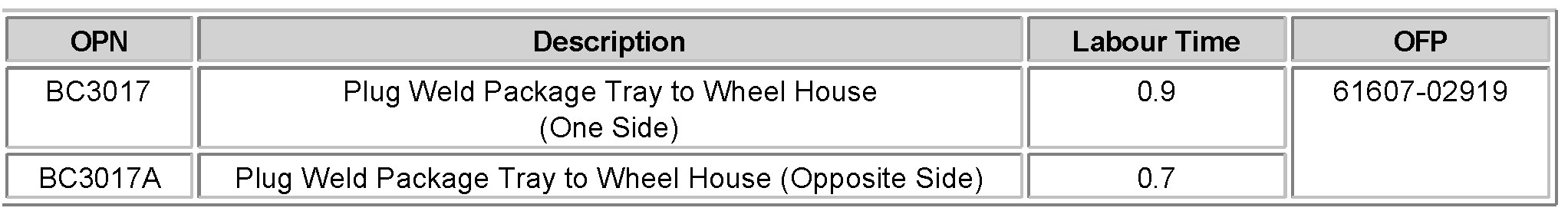 4. Carefully drill 2 holes (10-12 mm in diameter) 25 mm apart (refer to black dots in illustration) in the first panel (package tray). Plug weld (MIG) the package tray to the wheelhouse.
