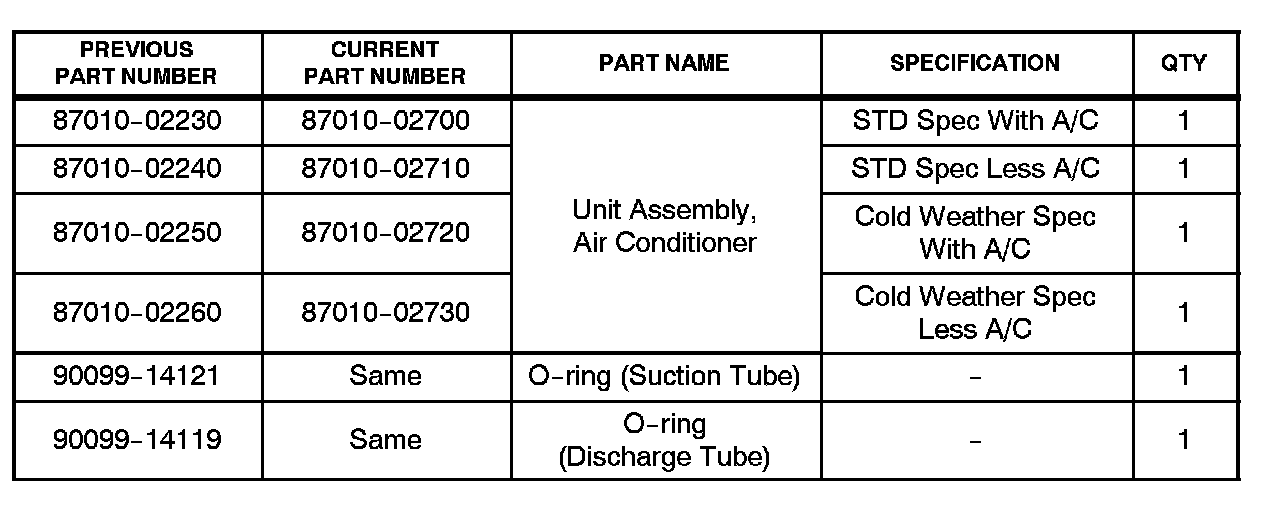Customers in areas with extremely low ambient temperatures may complain of poor heater performance during city driving conditions. The Air Conditioner Unit Assembly has been modified to improve this condition.