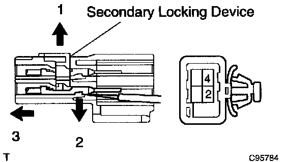 c. Using a small screwdriver, disengage the locking lug of the terminals 2 and 4, and pull the terminals out from the rear.